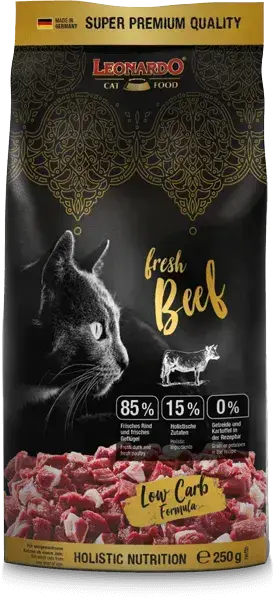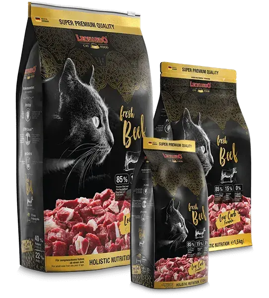 Kočky milují hovězí maso. Možná proto, že v přírodě by si jej samy neobstaraly. Také je bohaté na živiny od bylinek po olivový extrakt. Žádná správná šelma neodolá.Vyvážené složení řady Leonardo Fresh meat obsahuje vše důležité, co vaše kočka potřebuje ke zdravému a spokojenému životu.Méně je někdy víceDíky jedinečné receptuře bez obilovin a brambor obsahují granule Leonardo méně sacharidů, což mimořádně prospívá trávení vaší kočky. Hodí se i pro jedince s citlivým zažíváním. ,Lahodná chuť i pro konzervativní kočkyNěkteré kočky nemají změny rády a trucují, pokud jim předložíte jinou značku granulí. Přimíchávejte novou příchuť do granulí, na které je vaše kočka zvyklá a postupně navyšujte jejich podíl v krmné dávce, až zcela přejdete na obvyklou krmnou dávku. Jsme si ale jistí, že s granulemi Leonardo fresh meat rozhodně žádná kočka trucovat nebude. , ,