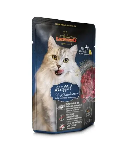 Buvolí maso je jedno z nejoblíbenějších , má menší obsah cholesterolu a více minerálů, než třeba hovězí. A kočky jeho chuť milují. Asi proto, že v přírodě by si jej tak snadno neobstaraly. Kapsičkou s buvolím masem a borůvkami se zavděčíte i nejzatvrzelejším gurmánům. ,Borůvky pro zdravé tráveníPřestože jsou kočky výhradními masožravci, potřebují ke správné funkci organismu také další nemasité složky. Jako jsou třeba borůvky. Obsahují vitamíny a důležité antioxidanty pro správnou funkci trávení.