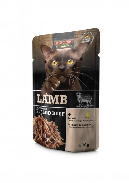 Kvalitní suroviny Jehněčí i hovězí maso pochází od osvědčených německých chovatelů ,a odpovídá nejvyšším normám potravinářské kvality. Důležitou součástí směsi je lososový olej, kterým je maso důkladně proloženo. , Vařeno se 100% zodpovědností ke zdraví a kvalitě , zcela bez cukru, só,ji a umělých barviv, dochucovadel, ani konzervantů. Vhodné i pro alergiky Bohaté na živiny Zdravé jehněčí maso a proteiny nabité hovězí dodají vaši kočce energii, stejně jako důležité vitamíny a minerály. , Nízký obsah tuků doplňují vitamíny skupiny B, zinek, mangan a jó,d. , Lososový olej je zdrojem omega 3 a omega 6 mastných kyselin, díky kterým bude srst vaší kočky ,hedvábná a lesklá. 100% zážitek z jídla Neodolatelná plná chuť vzniká pomalým vařením surovin. Delikátní paštika pohladí jazyk všech kočičích gurmánů a trhané kousky masa zaměstnají jejich zuby. Skvělá kombinace pro efektivní péči o kočičí chrup i podporu správného zažívání. ,
