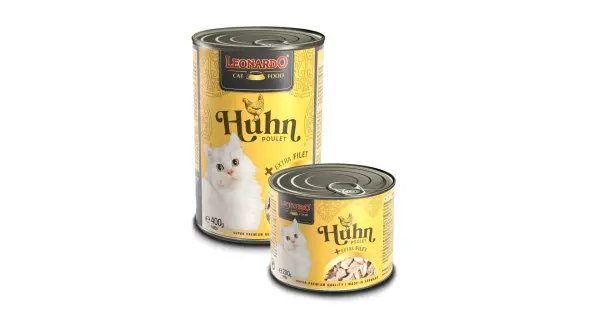 Kuřecí konzerva pro kočky s masem vařeným ve vlastní šťávě, s extra porcí kuřecího filetu a lososovým olejem. Kompletní krmivo pro kočky.