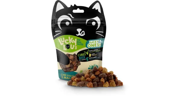 Lucky Ones Cubes jsou šťavnaté kostičky kuřecího, husího a jeleního masa, které se perfektně hodí pro časté odměňování a hru s vaší kočkou. Doplňkové krmivo pro kočky.